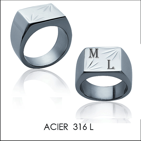 Chevaliere Homme Acier Carre Motifs Horizontaux Gravee Lettres Blanc Sable